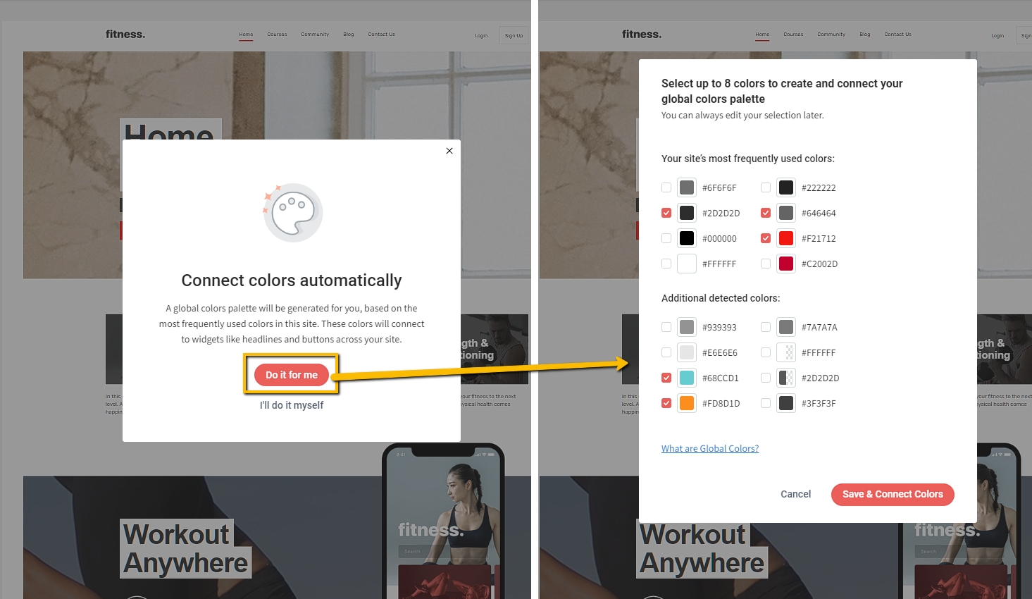 When global colors are used on a site for the first time, you will be prompted to manually add each color, or allow the builder to “Do it for me“. If “Do it for me” is selected, then the builder will scan the current site and pull in the most used colors from that site. Once global colors are finished scanning, you will be presented with a selection of colors. From this window, you can select up to 8 colors to create and connect your global colors palette.